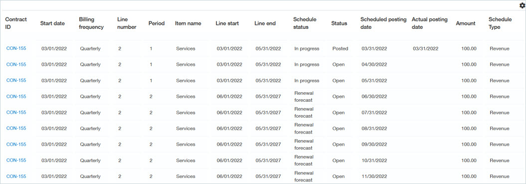 A revenue schedule for an evergreen contract line shows when the revenue associated with the corresponding recurring billing period is scheduled to be posted or was posted.
