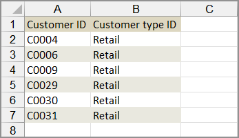 For example, the following file contains only the existing Customer ID, and Customer type ID.