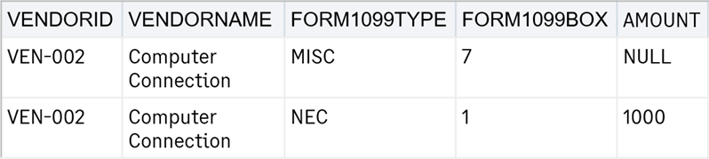You can specify various 1099 forms using the values DIV, INT, MISC, R, S, PATR, NEC, and G. Intacct updates this field if a value is present. If the value is blank, Intacct leaves the existing value in Intacct. To remove the existing value, enter the value NULL.