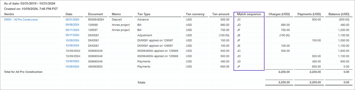 In the case of a credit, such as an adjustment or an advance, a match sequence is assigned to the credit when it’s applied to a transaction. You can track how the credit is matched to transactions by looking at credit's balancing entries, also called contra entries. The credit entry and the credit balancing entries share the same match sequence. This sequence displays in lower case letters until the credit is fully applied.