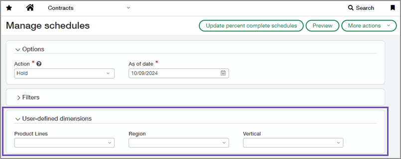 We added support for user-defined dimensions on the Manage Schedules page, giving you more ways to refine the list of schedules or contract lines on which you want to act. The new User-defined dimensions section is located under the Filters section.