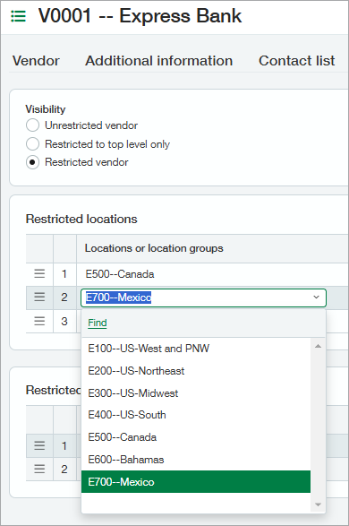 Selecting locations or departments for supplier restrictions now works similarly to adding entries in the supplier contact list. Add a new restriction on an empty line by selecting a location or department from the dropdown list. If you run out of empty lines, select Add. To remove a line, select Delete.