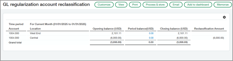After setting up regularization accounts, run the GL regularization account reclassification report to see which regularization accounts are eligible for reclassification. You'll then have the option to create the journal entries to move the balances from the original accounts to the reclassification accounts.