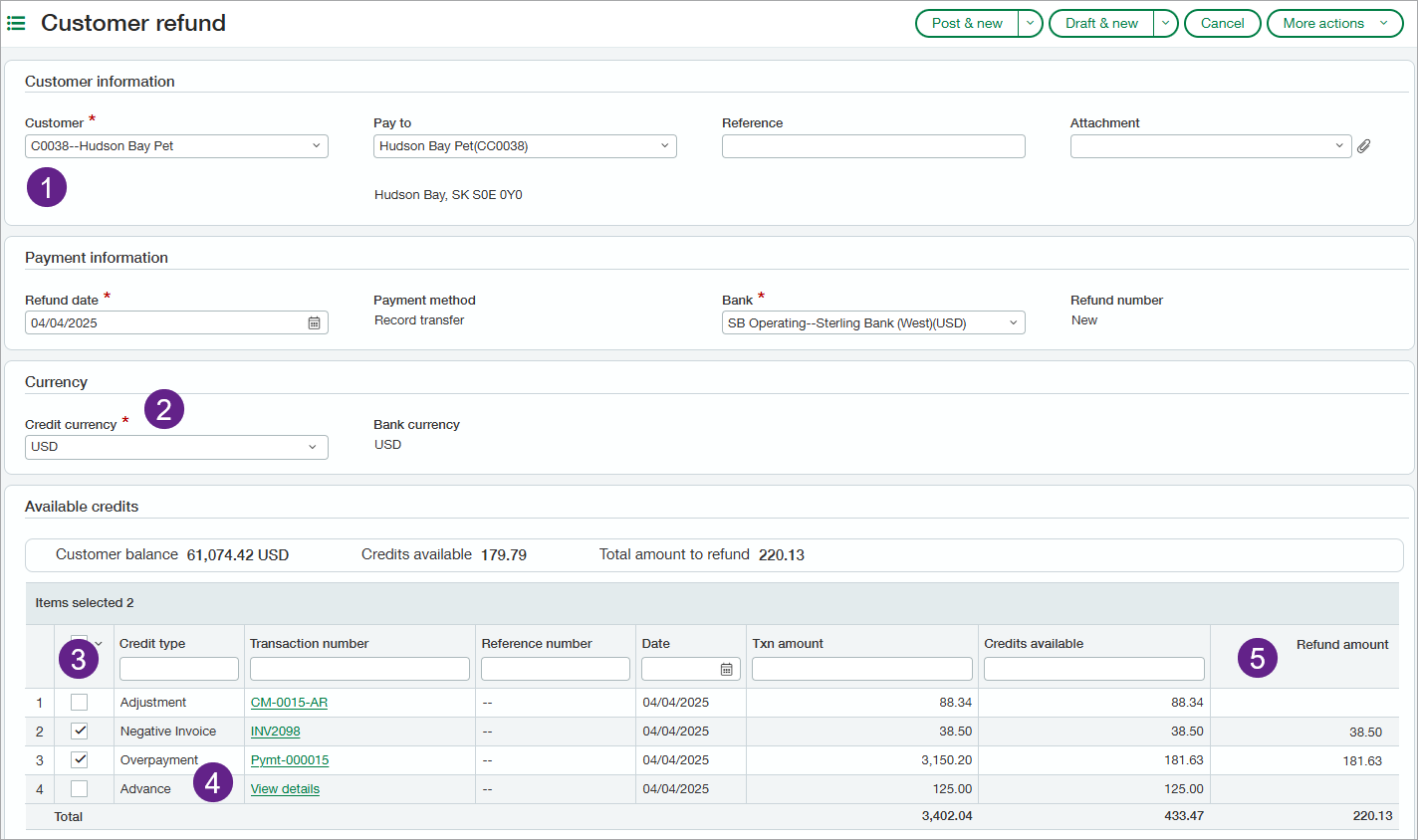 On the new Customer refunds page, record a refund using the record transfer payment method. Enter the amount you refunded and match it to the customer's available credits. Select from the customer's available advances, adjustments, overpayments, or negative AR sales invoices, applying amounts partially or in full.