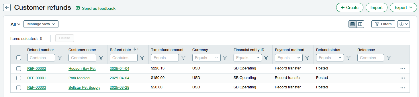 Review and manage both draft and posted refunds on the Customer refunds list. Drill down into refund details and from there, drill down into the credits that were refunded.