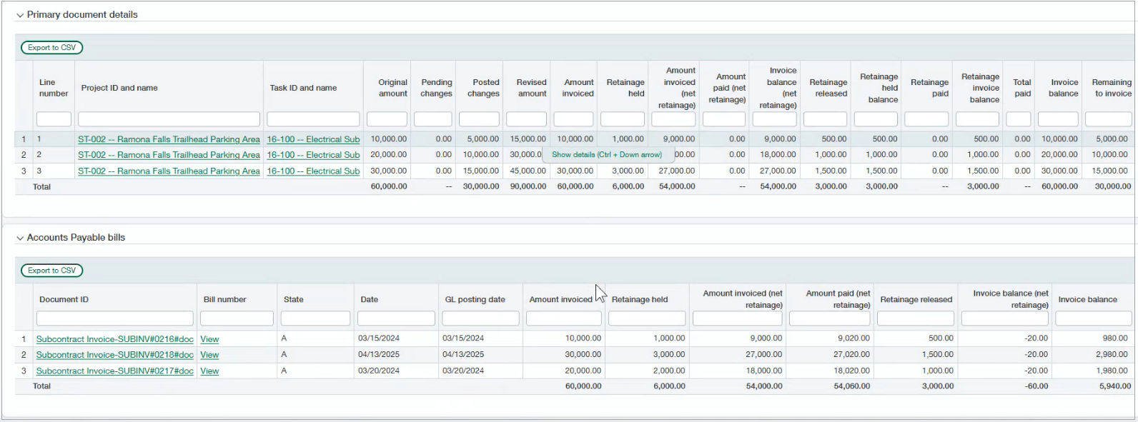 View a summary of all transactions for the document, then scroll to the details where you can drill into AP AP purchase invoices, retainage release bills, and AP payments.