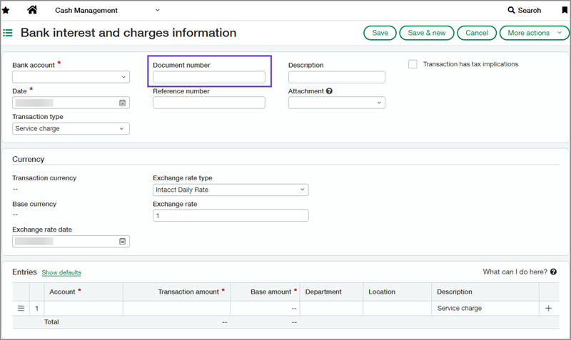 Improve accuracy when reconciling bank accounts by using the new Document number field on the Bank interest and charges page. This field is shown on all pages and reports that include a document number, for example the Bank interest and charges information page.