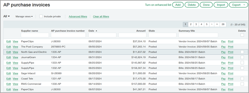Each line is an AP purchase invoice record, or an individual transaction. From the list, you can perform actions on these individual records with the Edit, View, Pay, and Print buttons. You could export a list of all these records. You could use the columns to sort or type in the column boxes to filter. To sum it up, when you're on a list, ask yourself "What specific thing am I looking for?". Lists are a key part of Intacct, so be sure to get familiar with them and how best to use them.