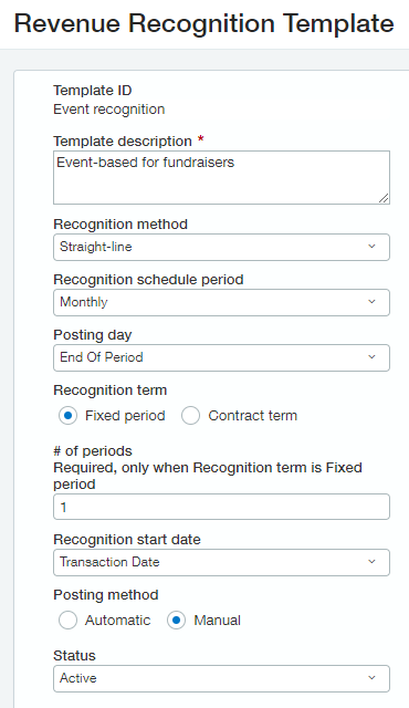 An example of a revenue recognition template for milestone-based revenue recognition includes the following settings: