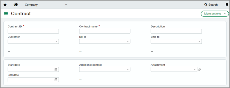 You can import contracts for OE from the Contracts list in Company or Reports. This option is not available in the Company Setup Checklist. Only the following template fields are applicable when importing contracts for OE: CONTRACT_ID, CONTRACT_NAME, CONTRACT_DESCRIPTION, BEGIN_DATE, END_DATE, CUSTOMER_ID, BILL_TO_CONTACT_NAME, SHIP_TO_CONTACT_NAME, APPLICATION, ADDITIONAL_CONTACT_CONTACT_NAME To import, APPLICATION must be set to Order entry. |