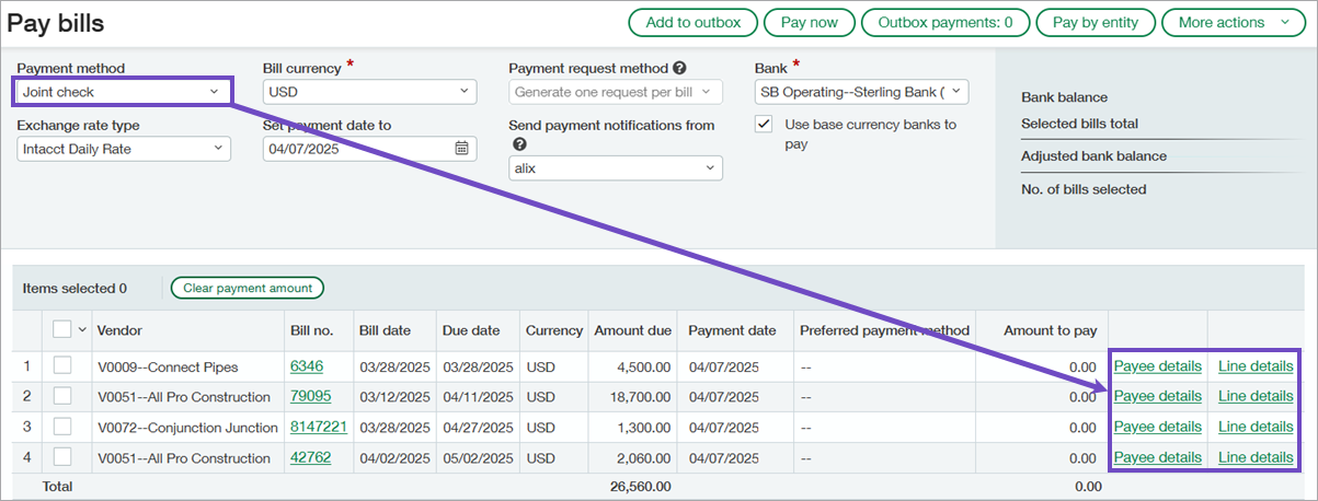 With joint cheques, you can add 1 or more joint payees to a bill and issue two-party checks to them. You can make payments to joint payees at either the bill level or line level.