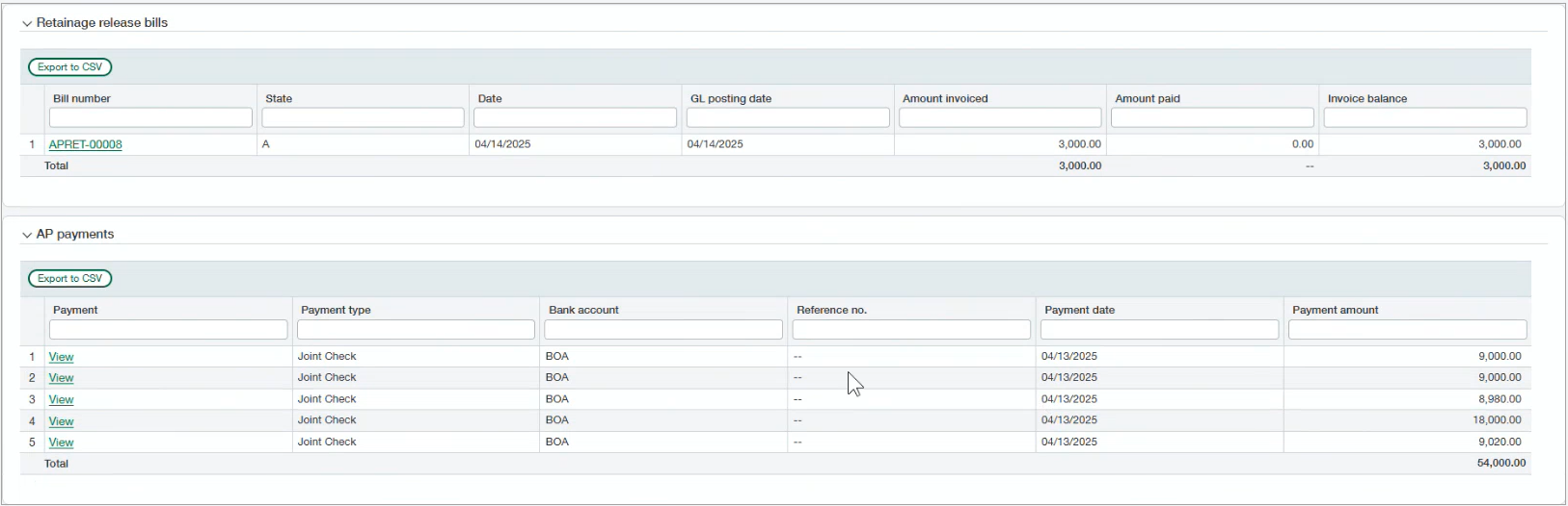 View a summary of all transactions for the document, then scroll to the details where you can drill into AP AP purchase invoices, retainage release bills, and AP payments.