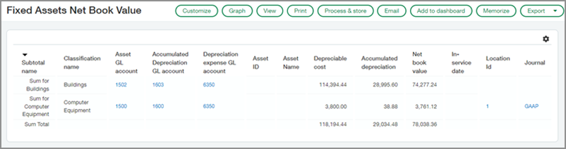 Fixed Assets Net Book Value: Displays the total net book value of assets in each asset classification after accounting for accumulated depreciation and salvage value (if salvage value is considered for the selected book). It also shows the sum total net book value of all your assets.
