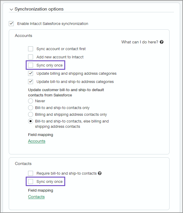 You can now choose to sync Accounts or Contacts from Salesforce to Intacct only once when an Account or Contact is created. This improves data accuracy and consistency across both systems and reduces the risk of conflicting updates.