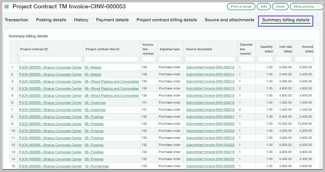You can now print time and materials and expenses billing details directly from project contract invoices, without creating a separate report. These billed expenses appear together for streamlined reporting and use on printed invoices.